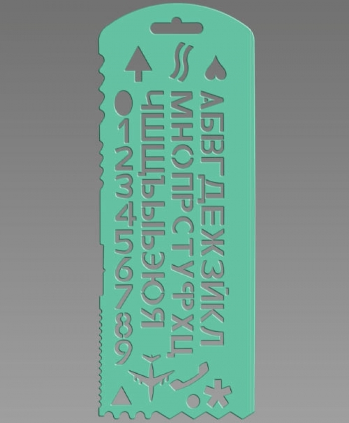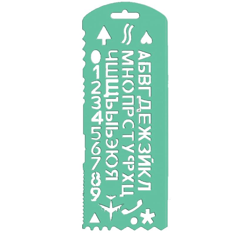 - Содержит 56 элементов. Все буквы русского алфавита, цифры, 6 типов подчеркивания, элемент «фигурная скобка», 9 специальных символов.- Гибкий трафарет зелёного цвета.